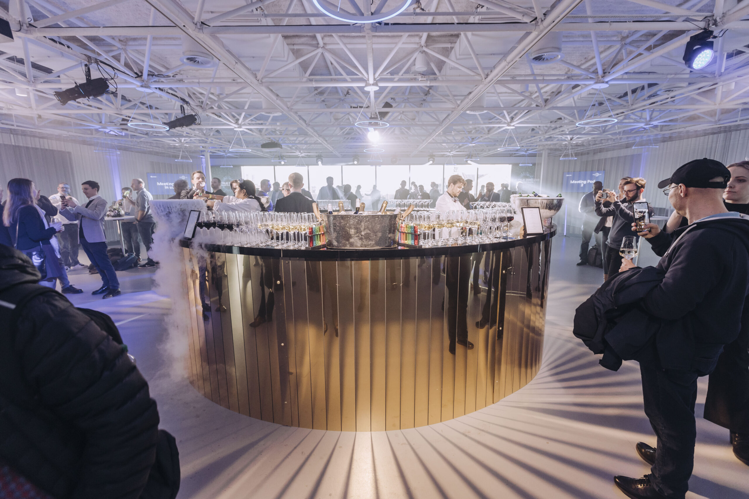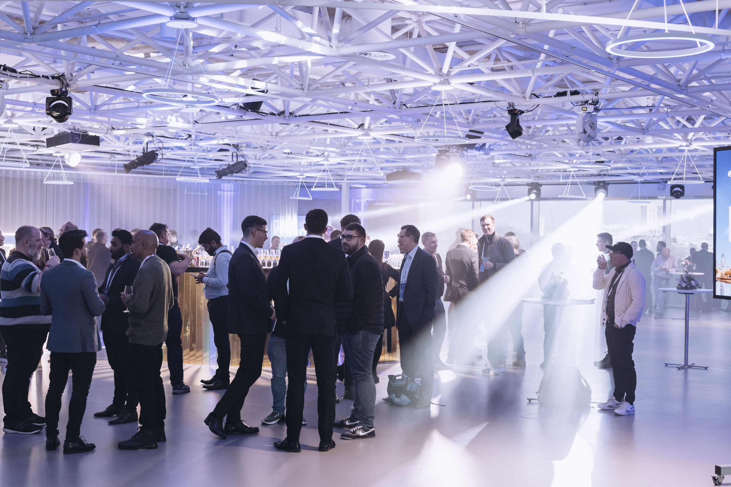 For the drinks reception in Level 5, White Lights’s lighting design consisted of uplighters, LED Titan Tubes and an array of static and moving fixtures. During the day, this was used to subtly enhance Illuminate’s architecture. This then intensified for the evening transition, accenting our corporate colours and delivering a dynamic texture and movement for the after-party – heightening the interactive displays.