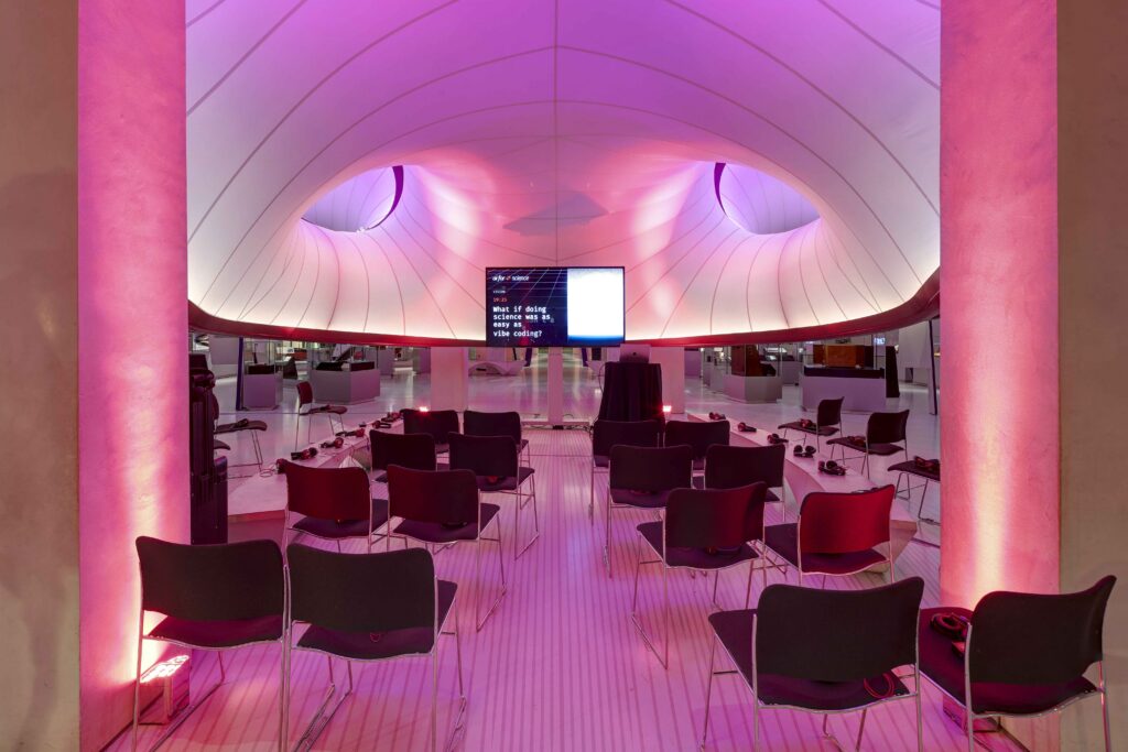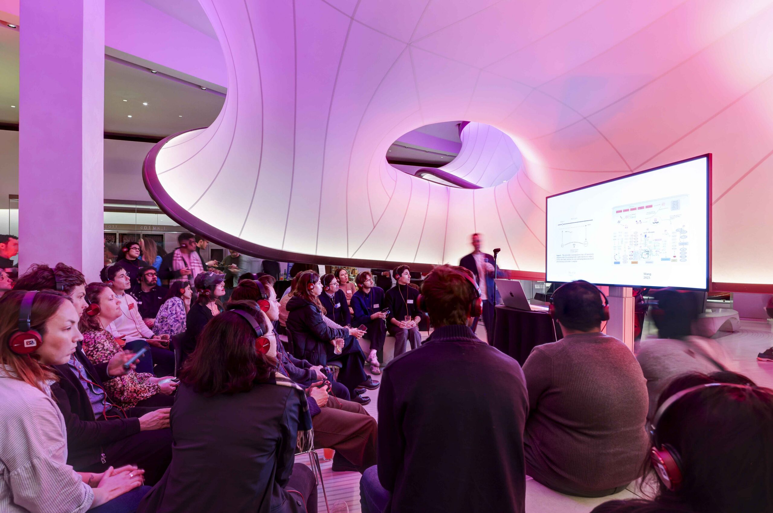 We chose the Science Museum because it offered an atmosphere that aligned perfectly with the themes we hoped to highlight. The Mathematics Gallery, and especially the Zaha Hadid structure at its centre, was a big draw and major source of inspirations for us. The way the galley showcases how mathematics shapes architecture, science, and technology resonated strongly with our focus on AI, data, and scientific advancement. We felt the space’s narrative and visual impact made it an inspiring setting for our event.