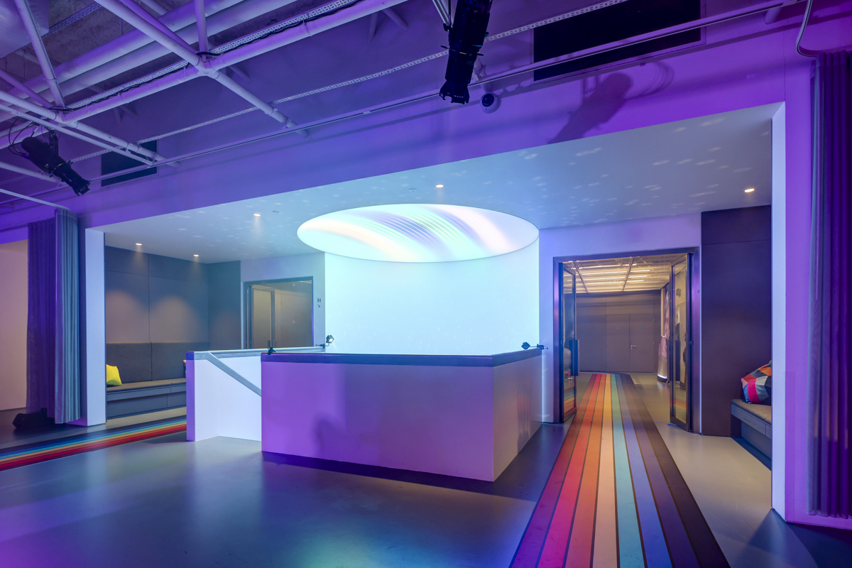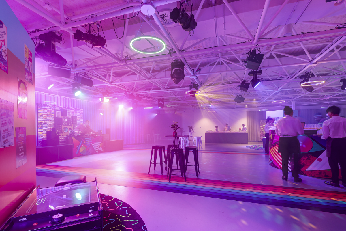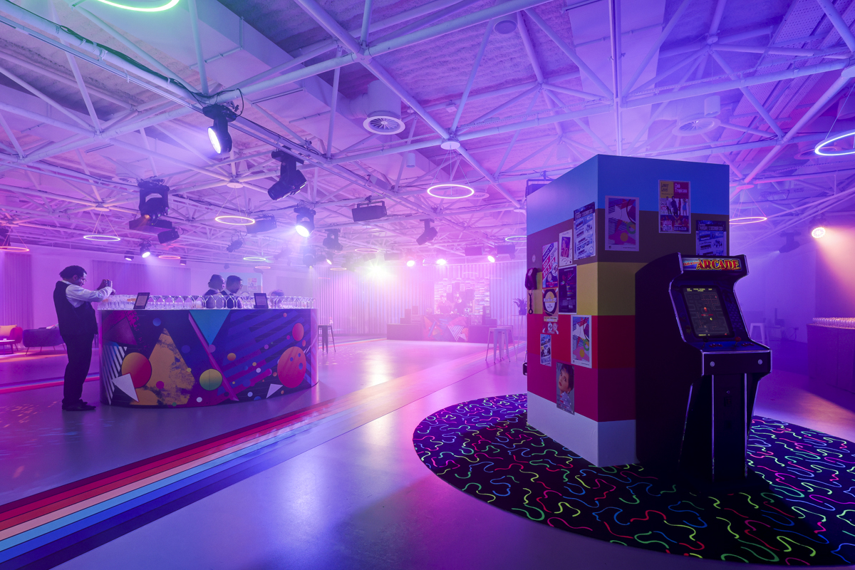 Custom lighting and sound design on Level 5 divided the space into distinct areas making up the Retro Lounge, including a DJ booth and dancing zone, along with quieter spaces for relaxation and arcade games.