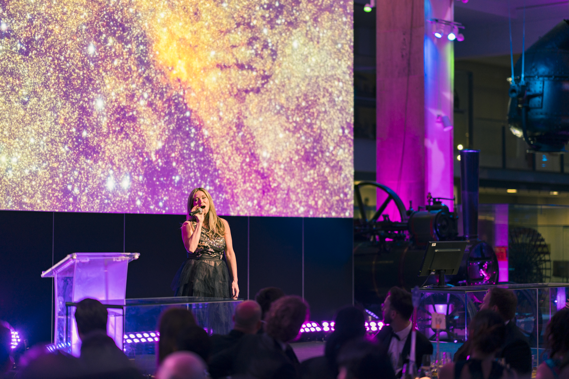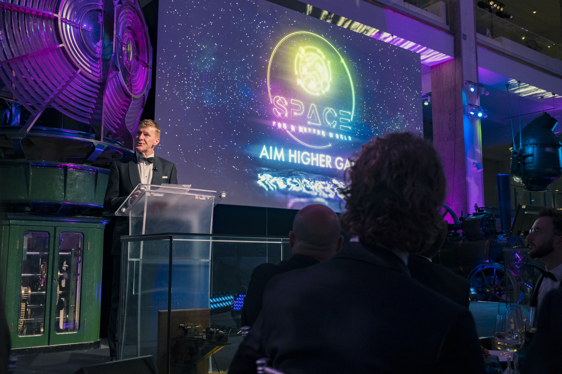In the flagship Making the Modern World gallery, a custom stage was constructed around the 1907 Eilean Glass lighthouse, flanked with two large projection screens, one for content and one for image magnification (IMAG) . The left-hand side was used to present awards to the many astronauts in attendance and the right-hand side stage was used for live music performances. Repeater screens in and among the dinner tables relayed all content, as well as IMAG so that all guests could clearly see the MC Dallas Campbell and award winners.